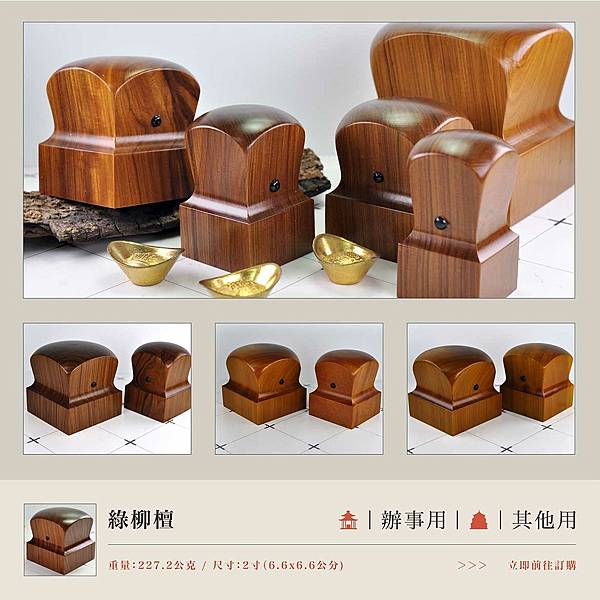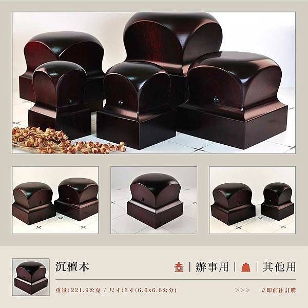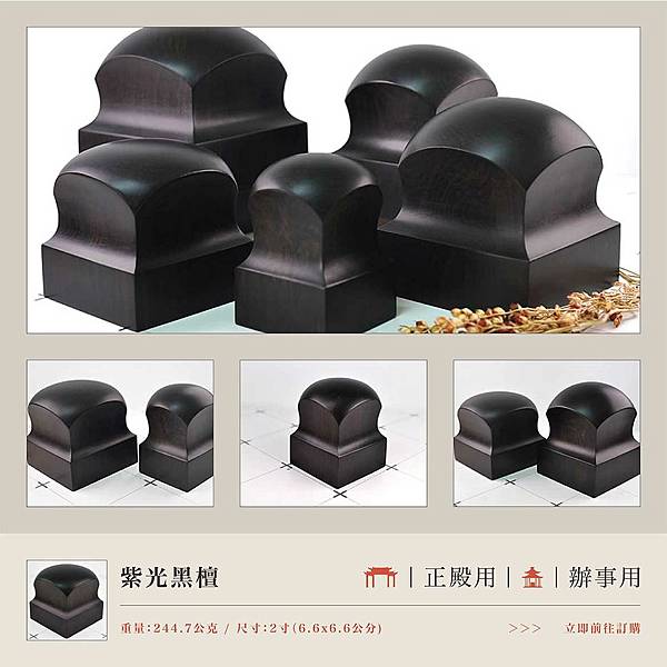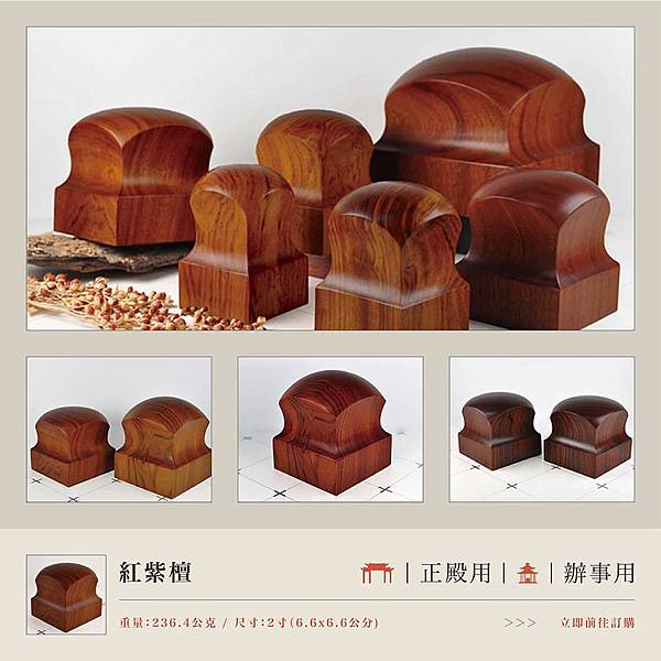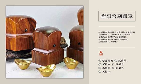 辦事用的神明印章在宮廟裡因需常常使用,所以在材質上會建議選擇硬度較高的材質以及裁切大小須以好拿為主的樣式為主,唯原工藝提供的材料樣式中有紫光黑檀神明印章,紅紫檀木神明印章,沉檀宮廟印章,綠柳檀宮廟印章,紅檀香神明印章,黃楊木神明印章,其中紅檀香神明印章的CP植為最高