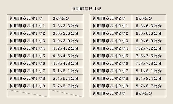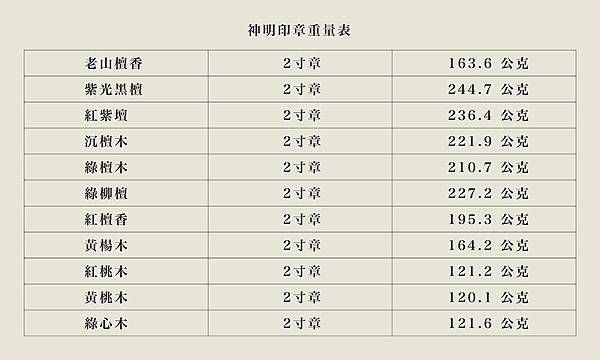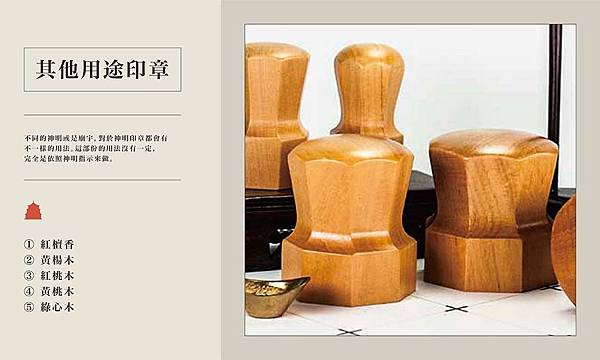 沒有固定的形式,通常是完全依照神明指示製作。唯原工藝在其他用途神明印章尺寸和材料充足,神明印章尺寸都有並且也可以訂做神明印章,目前比較推薦的以紅檀香神明印章為主,重量足,硬度較桃木高 以下為印章材質比重表(以2寸章為例)。